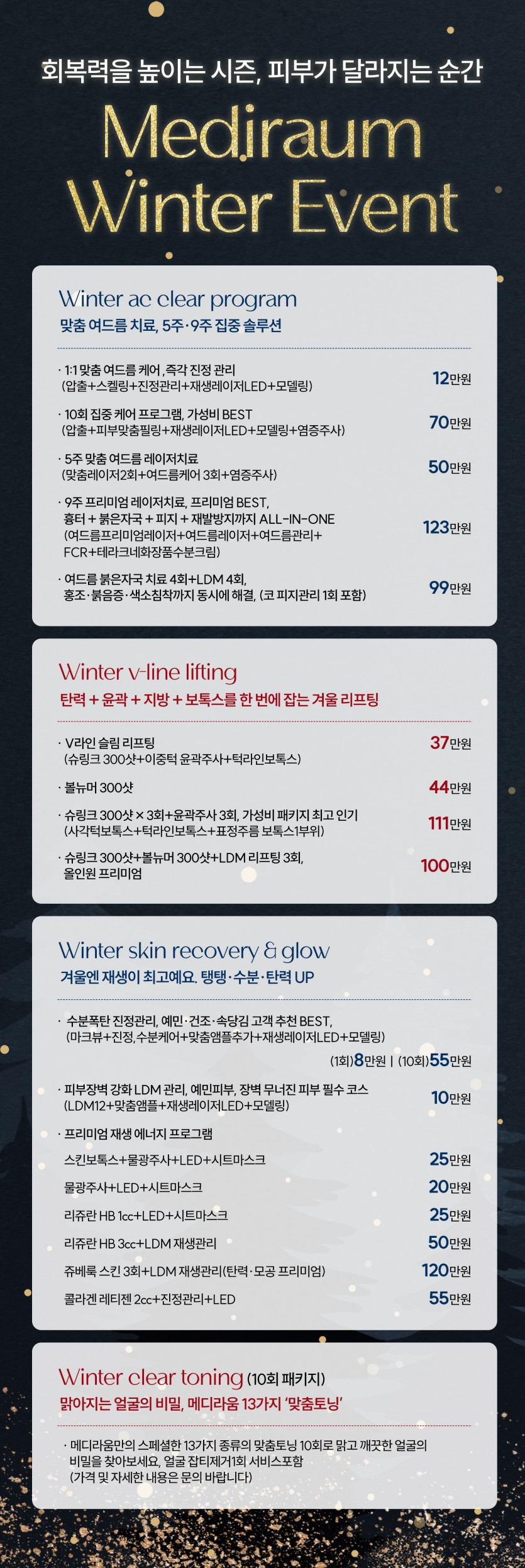 진행중 겨울이벤트 2025-12-01 ~ 2026-02-28 페이지 정보 작성자 최고관리자 댓글 0건 조회 40회 작성일 25-12-01 16:07 목록 본문 남다른 아름다움을 만나는 공간 2025 겨울이벤트 전 시술 VAT포함 다음글가을이벤트 25.09.01 댓글 0 댓글목록 등록된 댓글이 없습니다.